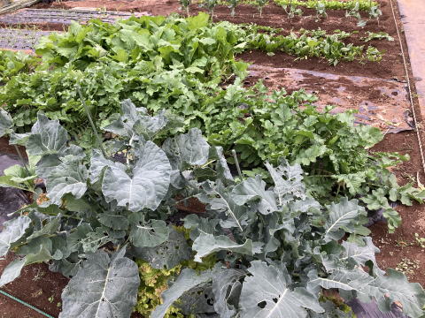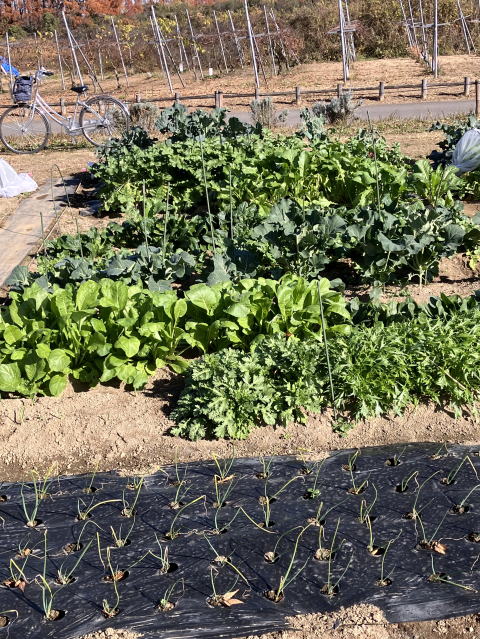| 手前:タマネギ、奥右:水菜、その奥:左:小松菜、右:ホウレンソウ |