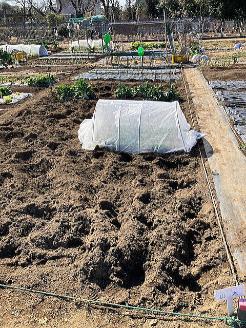 | カブ・大根撤収 土掘り返し 手前カバー:ホウレンソウ |